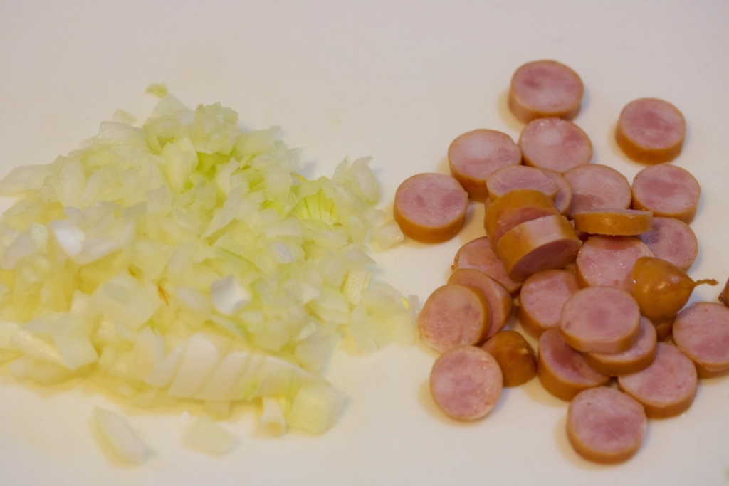 หั่นไส้กรอกเป็นชิ้นบาง ๆ สับหัวหอมเป็นชิ้นเล็กๆ