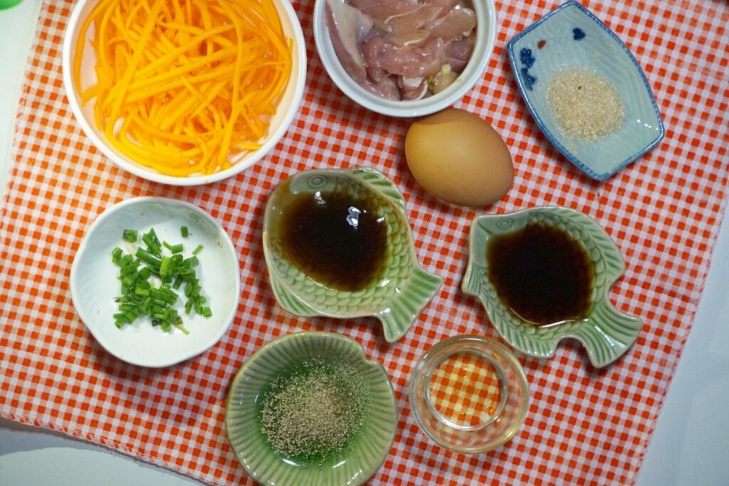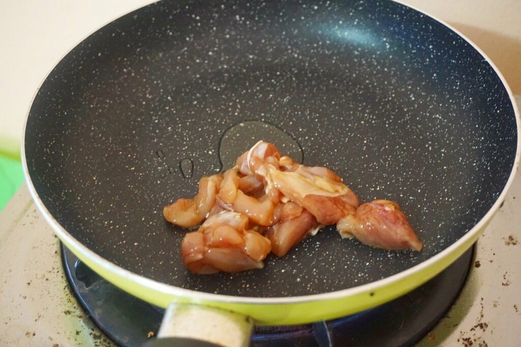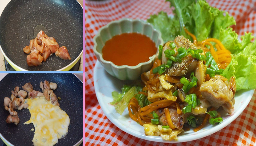 ตั้งกระทะโดยใช้ไฟอ่อน ใส่ไก่ที่หมักไว้ลงไปผัดให้สุก แล้วตอกไข่ลงไปผัดให้สุกแล้ว ใส่เส้นแครอท ปรุงรสด้วย ซีอิ๊วขาว 1 ช้อนชา และซอสหอยนางรม ผัดให้ทุกอย่างเข้ากัน