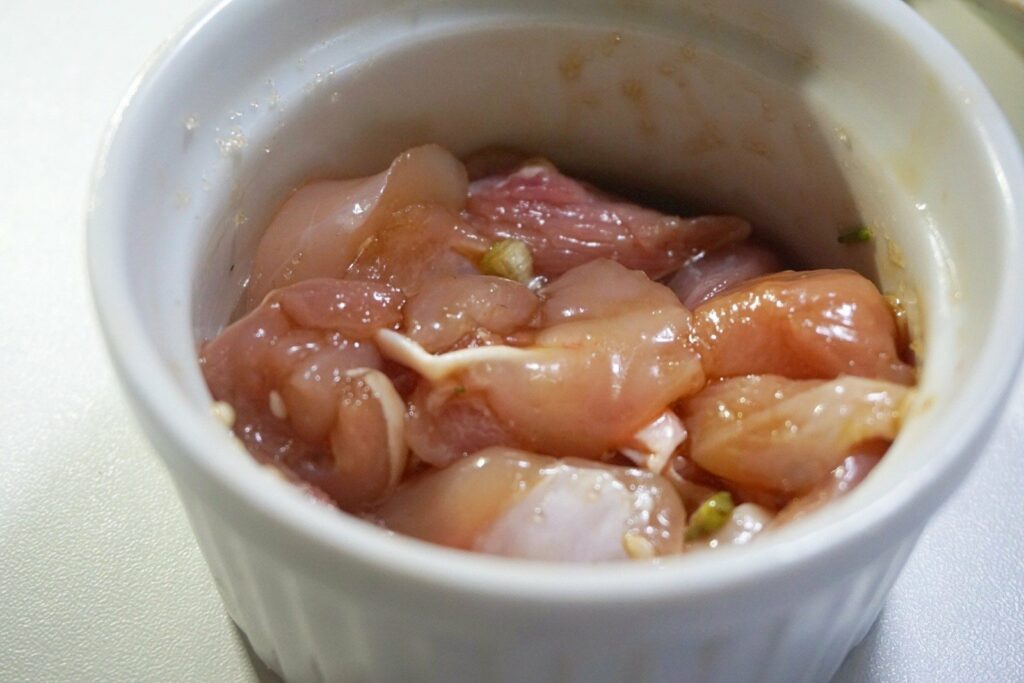 เริ่มนำอกไก่ไปหมักด้วยน้ำตาลทรายพริกไทยป่น ซีอิ๊ว 1 ช้อนชา แล้วพักไว้เป็นเวลา 20 นาที