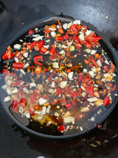 เริ่มตั้งกระทะใส่น้ำเล็กน้อย พริก กระเทียมสับ ซอสหอยนางรม ซีอิ้วขาว น้ำปลา น้ำตาล