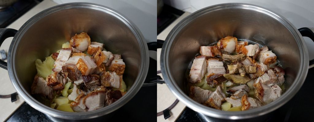 แล้วใส่หมูกรอบและน้ำหรือน้ำซุปให้ท่วม