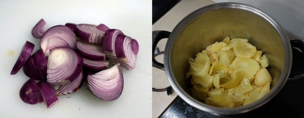 แล้วนำหอมแขก หรือ หอมใหญ่ มาใส่ในหม้อ ตามด้วยผักกาดดอง