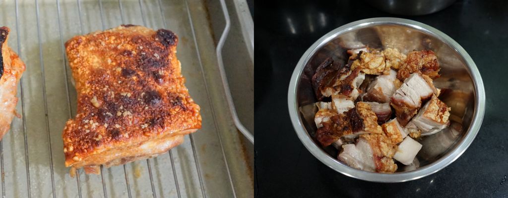 เริ่มนำหมูกรอบหั่นชิ้นใหญ่พอดี