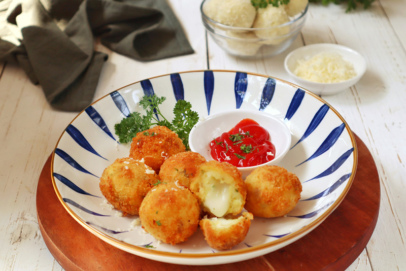 ตั้งกระทะ ใส่น้ำมันให้ร้อน นำชีสบอลลงทอดประมาณ 35 วินาที จนกว่าผิวด้านนอกจะเป็นสีน้ำตาลทอง จากนั้นตักขึ้นพักไว้ให้สะเด็ดน้ำมัน จัดลงจานได้แล้วโรยพาสลีย์ เพื่อตกแต่งเสิร์ฟพร้อมซอสมะเขือเทศหรือมายองเนสได้เลยค่าา