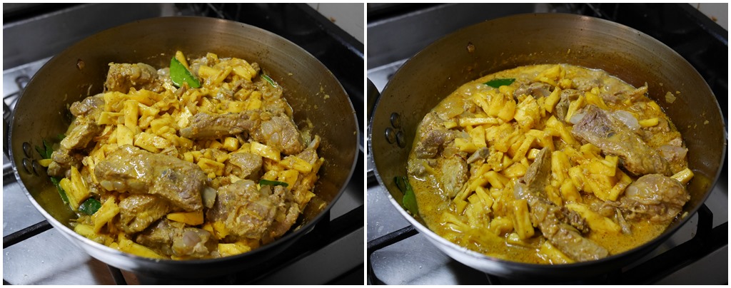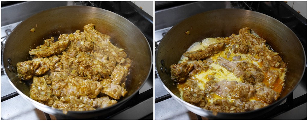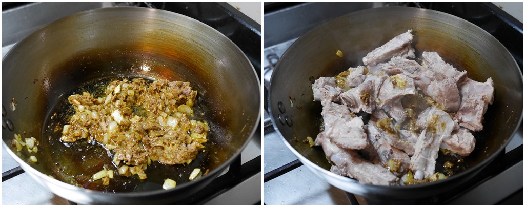 ผัดไฟอ่อนพอพริกแกงสุกหอม ใส่ซี่โครงหมูลงไป เติมหัวกะทิ