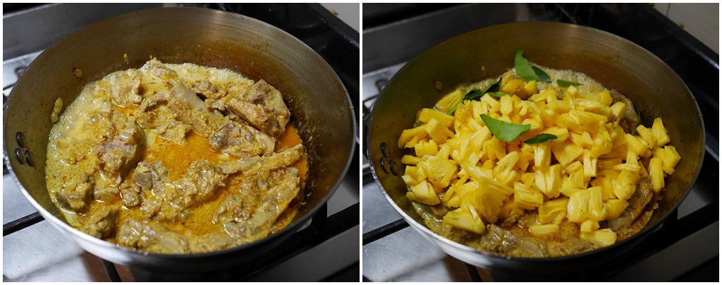 เคี่ยวไฟอ่อน 7 นาที สัปปะรดสุก ปรุงรสด้วย น้ำปลา และ น้ำตาลปึก ให้มี รสเผ็ด เค็ม เปรี้ยว