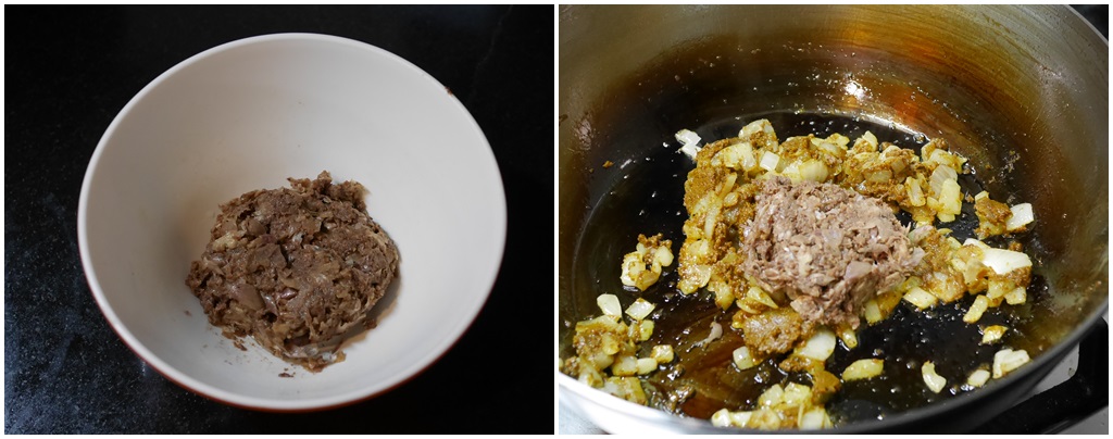 เริ่มเอาหอมแดง กระเทียม กะปิ ตำแล้ว เอาไปผัดกับพริกแกง