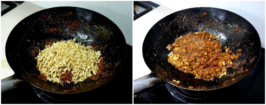 นำพริกแกงพริกขิงไปผัดกับน้ำมัน จนมีน้ำมันสีแดงออกมาจากพริกแกง
