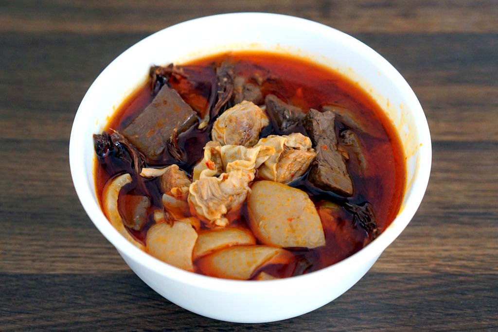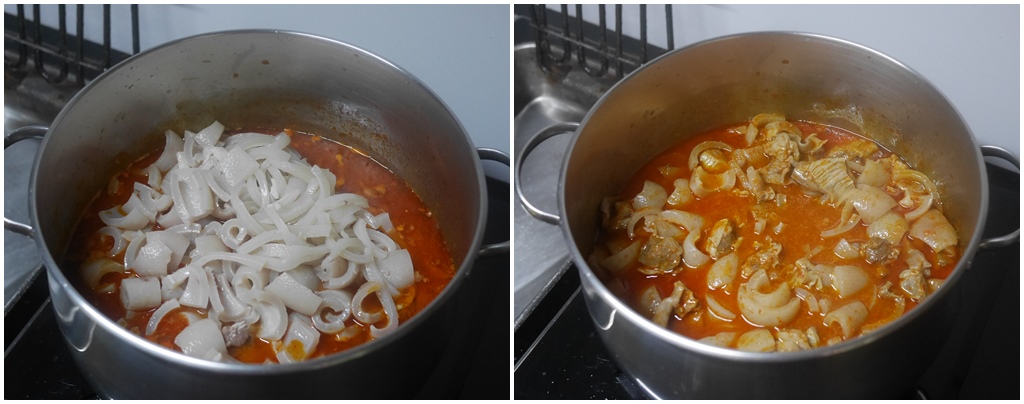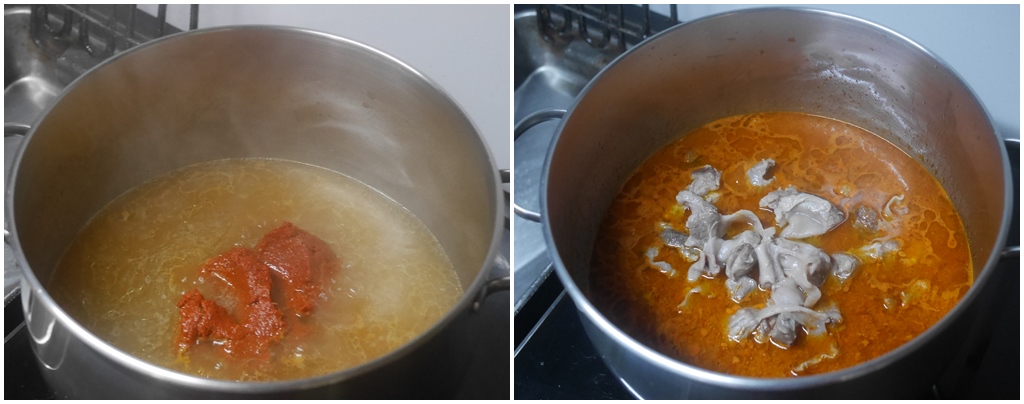 เอาพริกแกงละลายในน้ำซุปที่ต้มขั้วตับหมู ตั้งให้เดือด ใส่ขั้วตับหมูที่ต้มเปือยลงไป