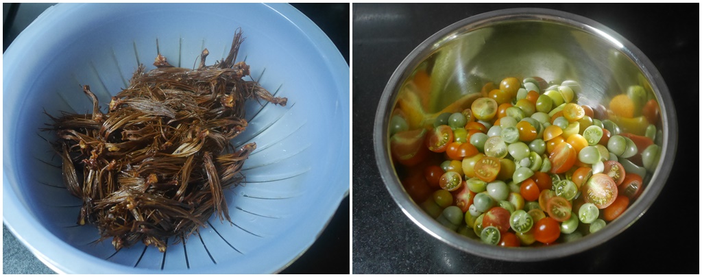 ดอกงิ้วแช่น้ำก่อนให้นิ่ม มะเขือส้มผ่าครึ่งไว้