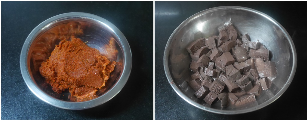 พริกแกงเผ็ดและ เลือดหมูนำไปลวกก่อนแล้วหั่นเป็นชิ้นเล็กพอดี