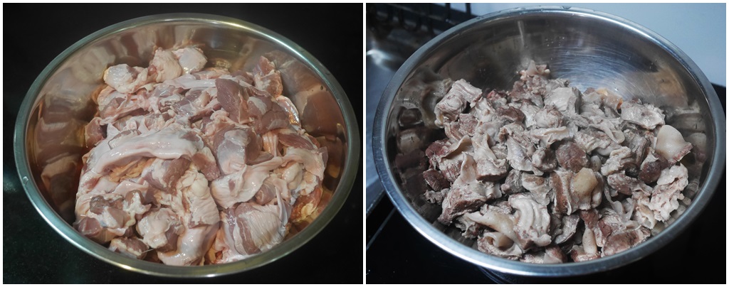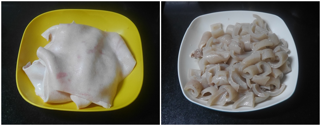 นำหนังหมูขูดขนออกให้หมด นำไปต้มให้เปื่อยและหั่นเป็นชิ้นเล็ก