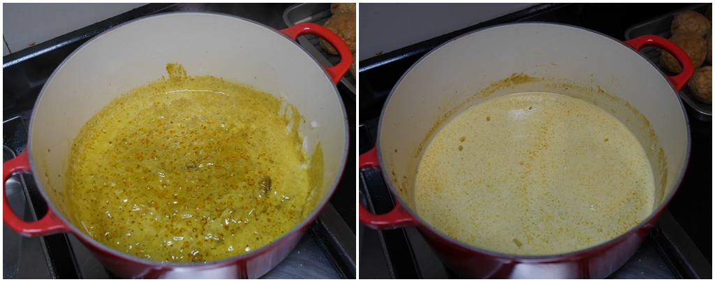 ผัดให้พริกแกงหอมสุก จนน้ำมันแยกออกมา ใส่หัวกะทิเพิ่ม