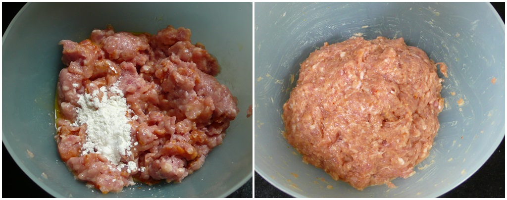 เริ่มเอาหมูสับ ใส่ ซีอิ้วขาว แป้งสาลี และ ไข่ 1 ฟอง คลุกให้เข้ากัน เพื่อให้เนื้อหมูเหนียว