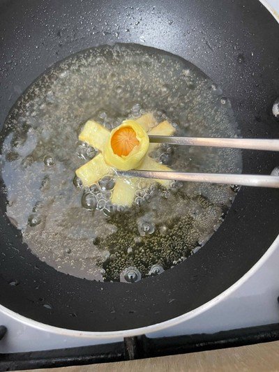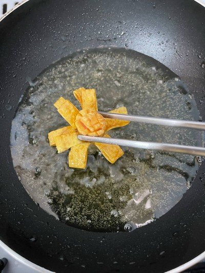 นำทอดด้วยการคว่ำหน้าก่อน พอเปลี่ยนสี แสดงว่าเกี้ยวเซ็ทตัวแล้ว