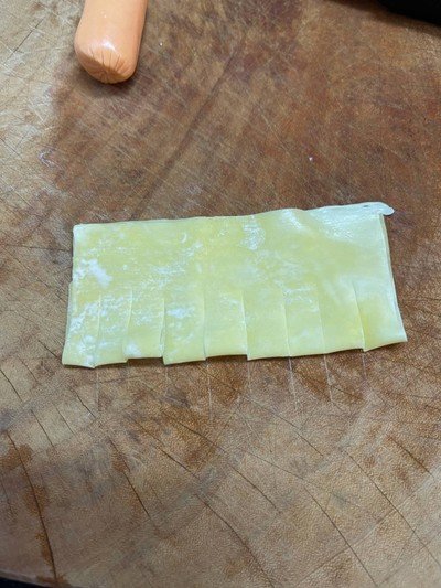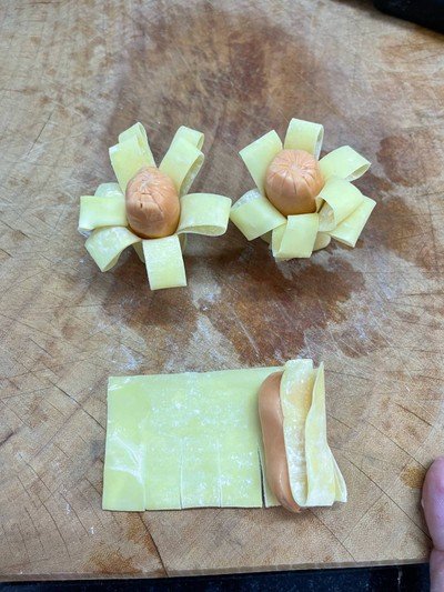 แล้ววางไส้กรอกส่วนที่เป็นเกสร ตรงริ้วกลีบดอก ม้วนแผ่น แตะน้ำที่ปลายแผ่นเกี้ยวเพื่อประสาน แผ่กลีบดอก