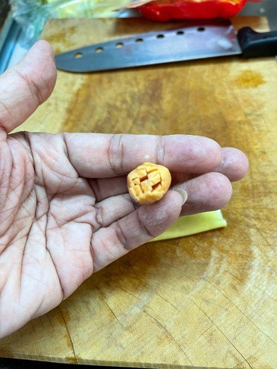 เริ่มบั้งปลายไส้กรอกด้านนึงเป็นตาราง ทำเป็นเกสร