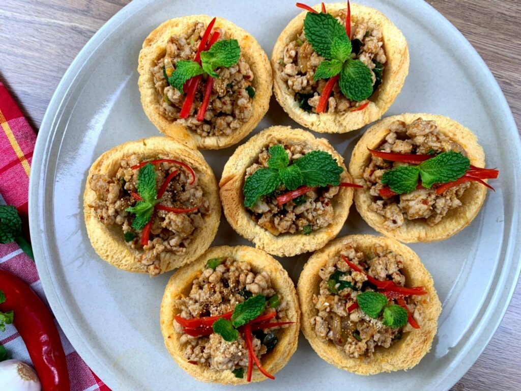 นำลาบหมูที่เตรียมไว้ ใส่บนกระทงกรอบ ตกแต่งด้วยพริกชี้ฟ้าแดง และใบสะระแหน่ทานได้เลยค่าาา