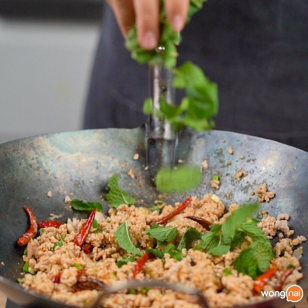 โรยใบสะระแหน่ คลุกเคล้าให้เข้ากันอีกรอบ แล้วใส่ชามเตรียมไว้