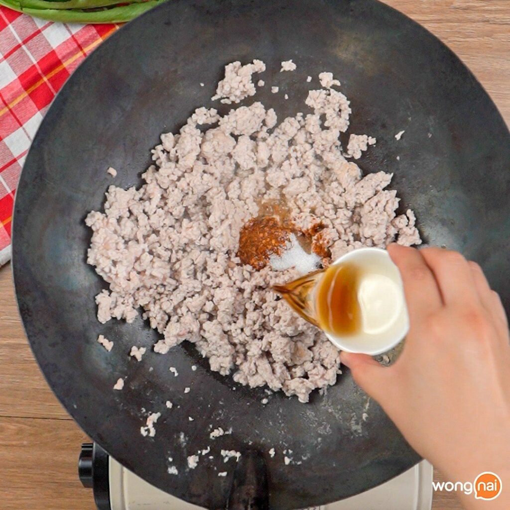 ตั้งกระทะใส่หมูสับ รวนหมูให้สุก แล้วปรุงรสด้วย พริกป่น น้ำตาล น้ำปลา มะนาวแล้วคลุกเคล้าให้เข้ากัน
