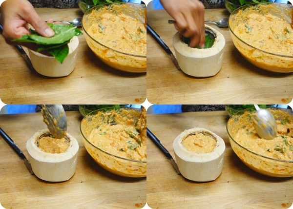 ใส่กระชาย พริก, ตะไคร้, ใบมะกรูด, กะหล่ำ, และเนื้อมะพร้าว และเนื้อปลากระพงสไลซ์ชิ้นหนา คลุกเคล้าให้เข้ากัน ตักใส่มะพร้าว