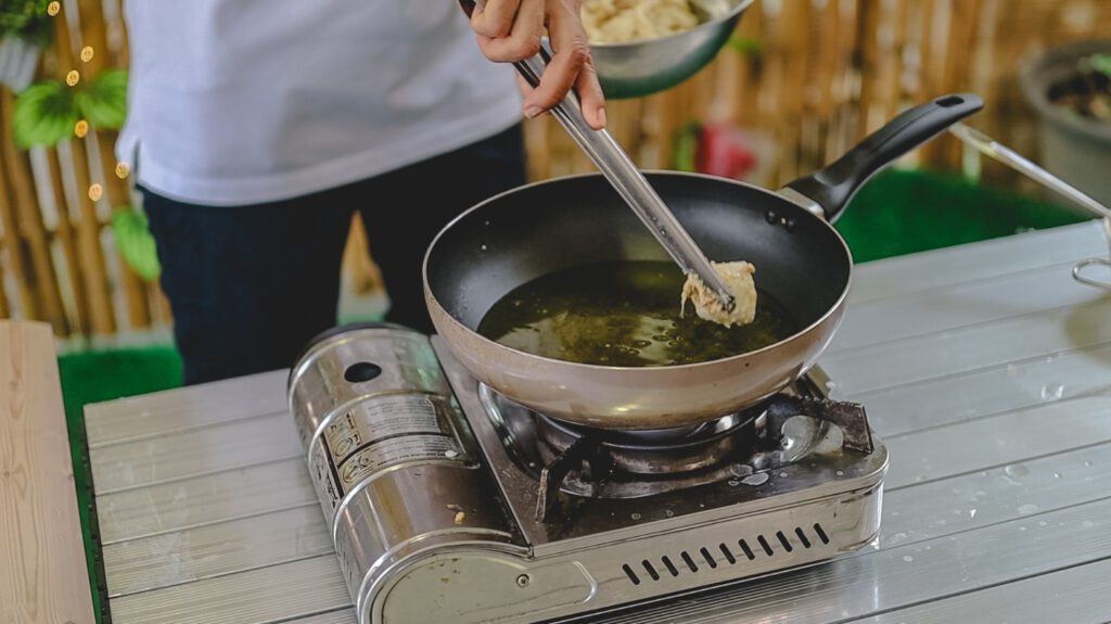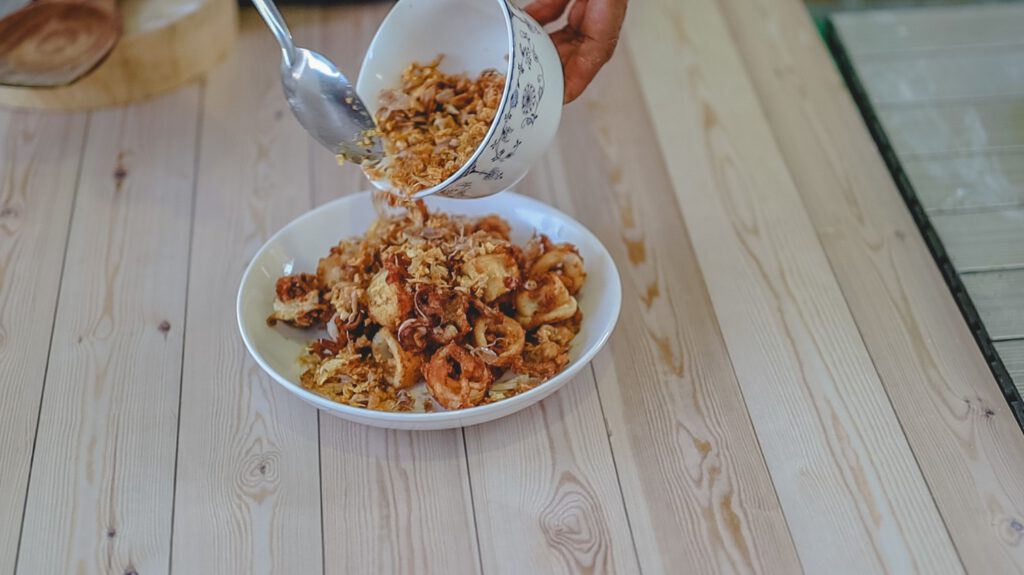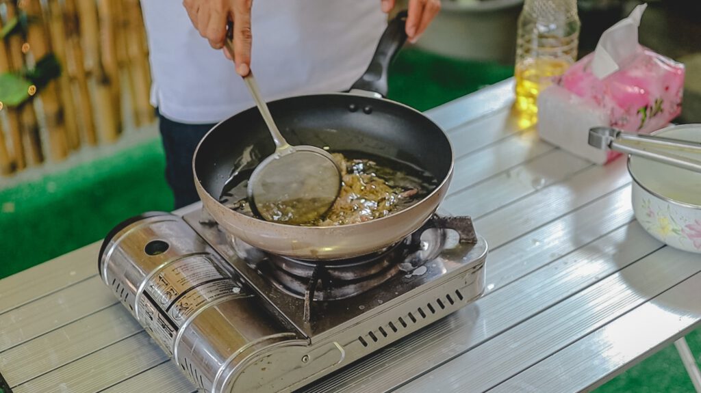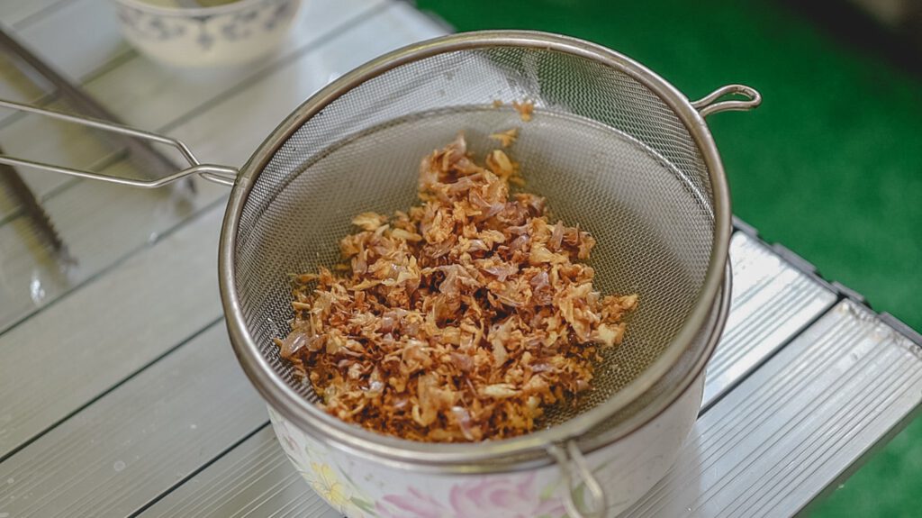 ตั้งกระทะใส่น้ำมันนำกระเทียมอีกส่วนที่เหลือมาบดแล้วนำมาเจียวให้เหลืองหอม ตักขึ้นพักให้สะเด็ดน้ำมันไว้