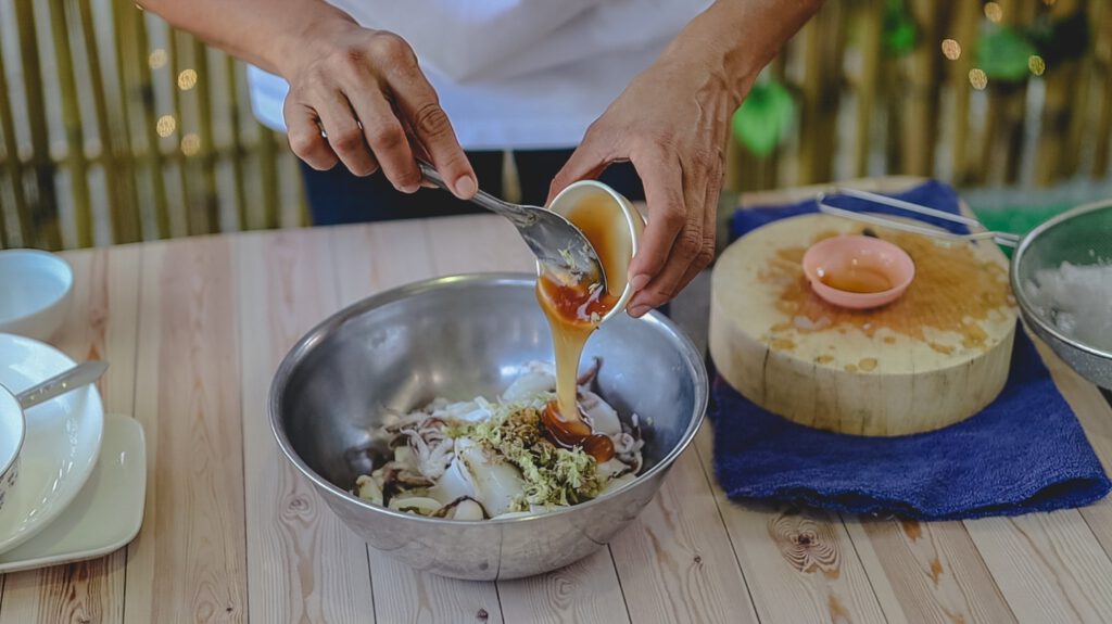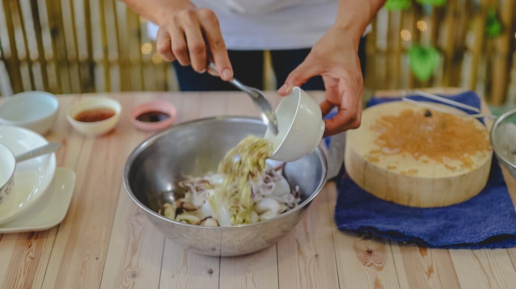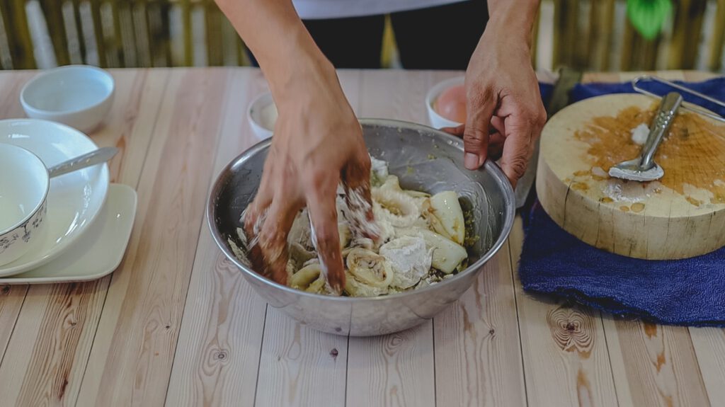 ตำรากผักชี กระเทียม และพริกไทยให้ละเอียดนำมาหมักกับปลาหมึก ซอสปรุงรส ซอสหอยนางรม คลุกเคล้าให้เข้ากันดี