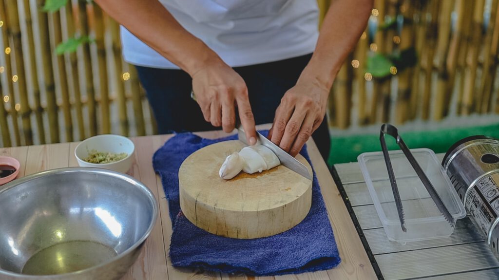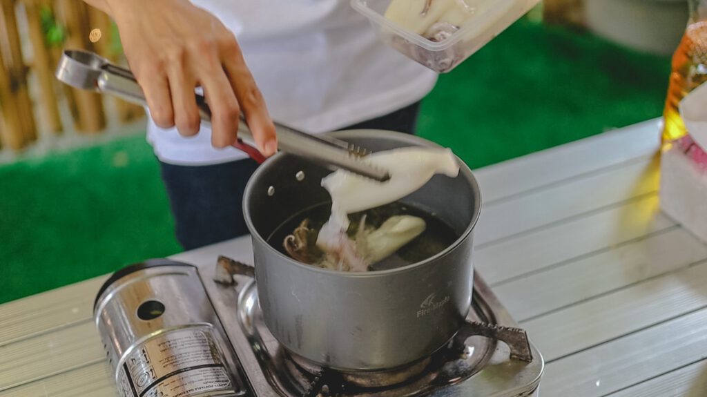 เริ่มต้มน้ำให้เดือดแล้วนำปลาหมึกทั้งตัวไปลวกพอสุก พักให้เย็นแล้วนำมาหั่นเป็นชิ้นพอดีคำ