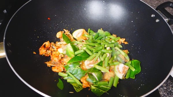 ใส่ใบมะกรูดฉีกลงไป ใส่ถั่วฝักยาวลงไปด้วย ผัดให้เข้ากัน