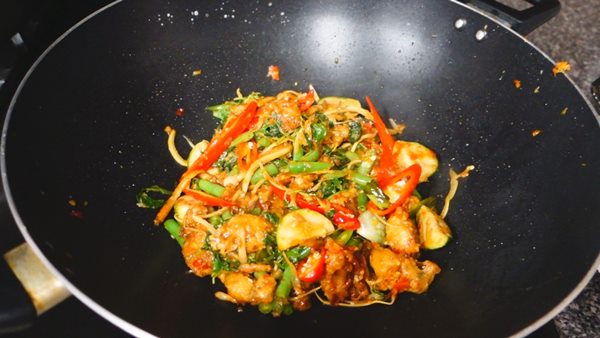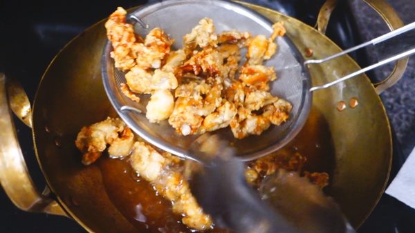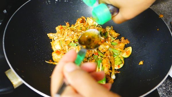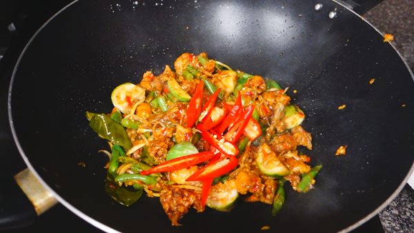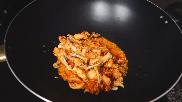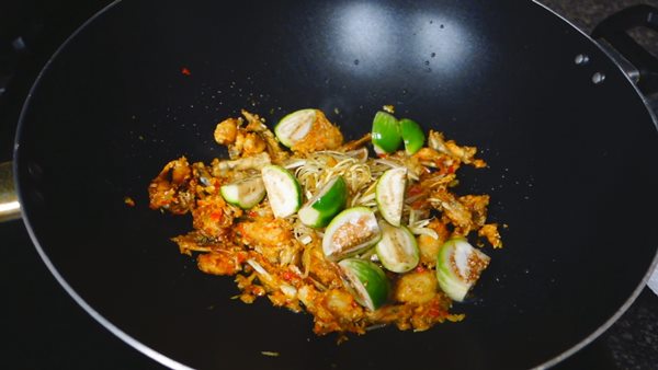 จากนั้นนำกบทอดกรอบลงไปผัด
