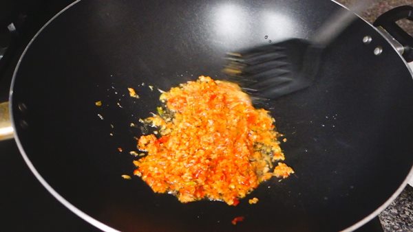 ตั้งกระทะใส่น้ำมันพืชลงไปนิดหน่อย แล้วตักพริกกับกระเทียมตำลงไปผัดให้หอม ใช้ไฟอ่อน