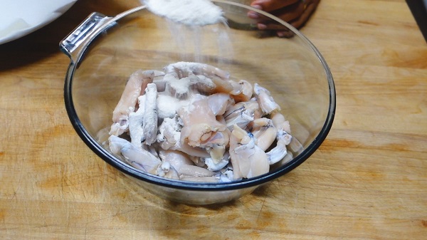จากนั้นนำส่วนน่องกบ เอามาสับให้เป็นชิ้นเล็กพอดี แล้วก็ล้างให้สะอาด พักให้แห้งนิดหนึ่ง แล้วนำมาคลุกกับแป้งสาลี แป้งข้าวเจ้า หรือแป้งทอดกรอบก็ได้ค่ะ