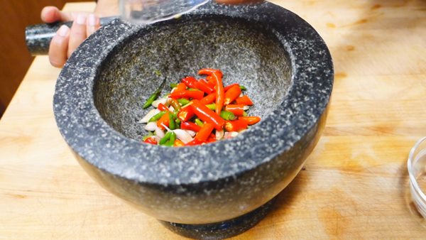 เริ่มจากตำกระเทียม พริกขี้หนู และรากผักชีก่อน