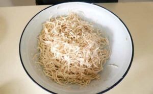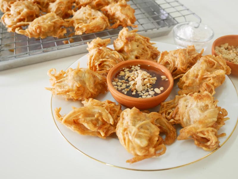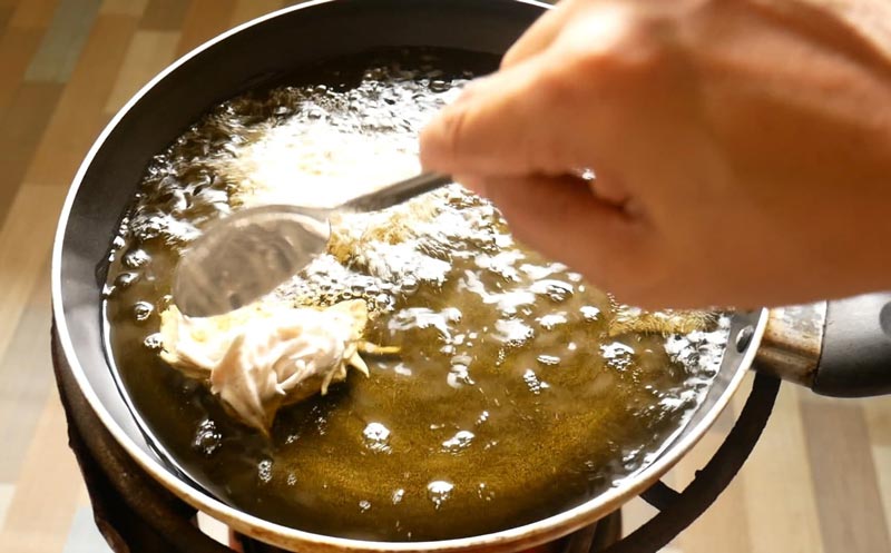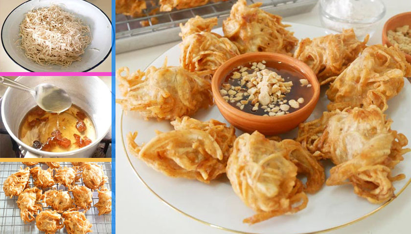 แล้วตักขึ้นบนตะแกรงพักให้สะเด็ดน้ำมัน