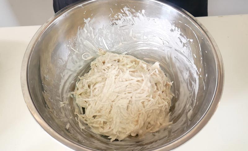 ทยอยเอาเผือกที่ขูดไว้ใส่ลงในชามแป้งที่ผสมไว้ แล้วคลุกให้เข้ากัน