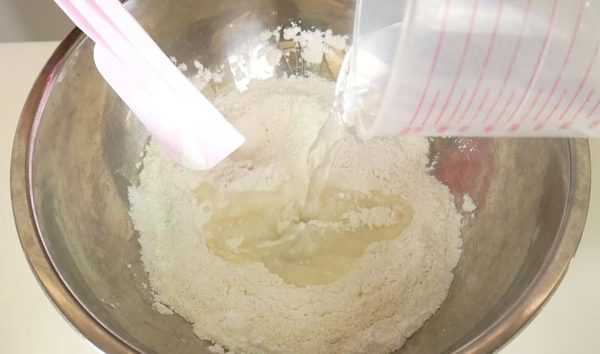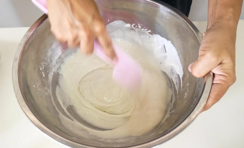 ผสมแป้งทั้ง 3 ชนิด ผงฟู น้ำตาลทราย และน้ำปูนใส ลงในชามผสม คนให้เข้ากันดี