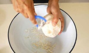 เริ่มจากปอกเปลือกแล้วล้างเผือกให้สะอาด ใช้ที่ขูดมะละกอขูดเป็นเส้นรอไว้