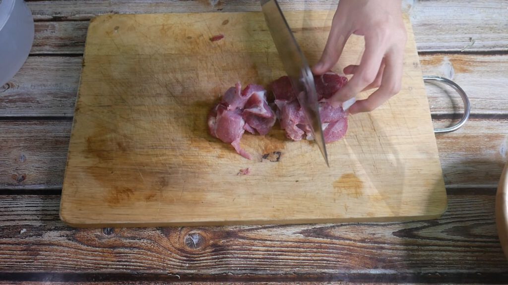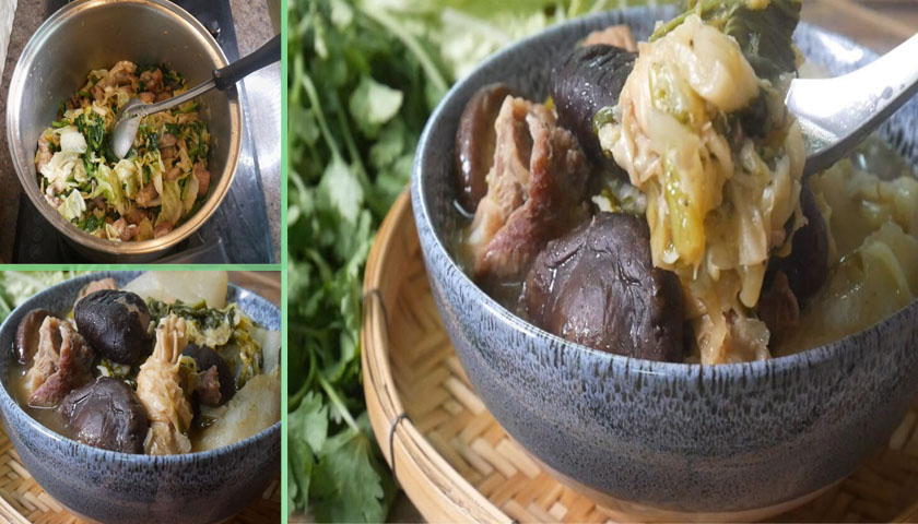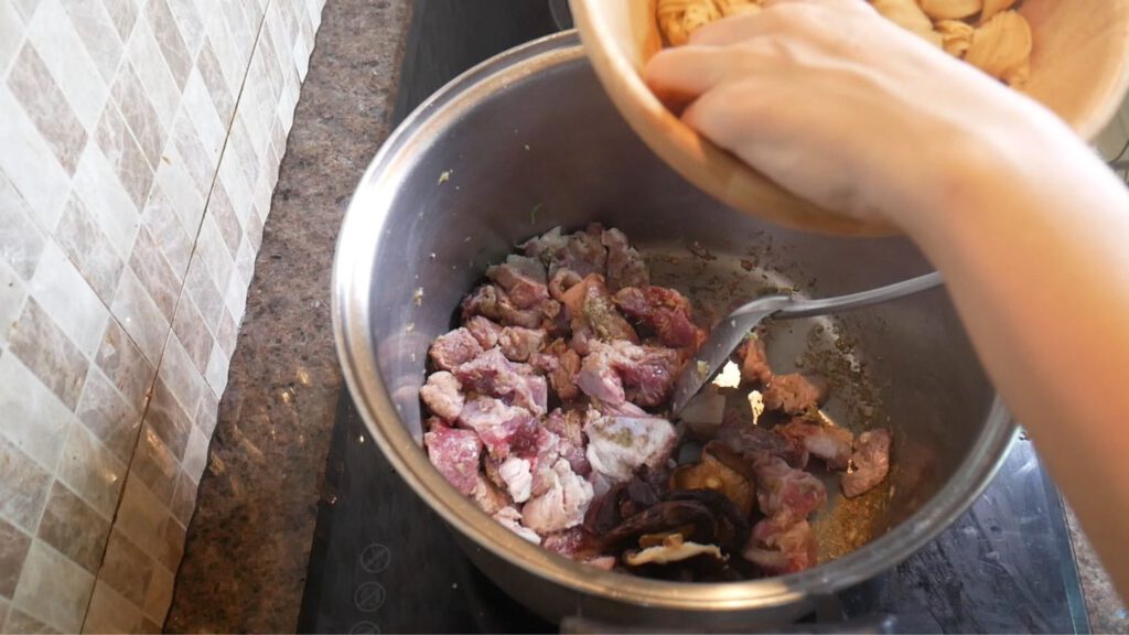 ตั้งหม้อหรือกะทะ ใส่น้ำมัน ผัด3 เกลอให้หอมและใส่หมูลงไปผัดให้พอสุก และใส่เห็ดหัวหอมลงไปผัดด้วยกัน