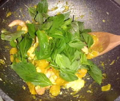 ตามด้วยใบโหระพาลงไปผัดให้เข้ากัน แล้วปิดเตาตักใส่จานได้