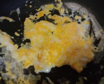 ระหว่างรอฟักทองสุก มาผัดไข่เตรียมไว้ ตอกไข่ใส่กระทะ รอให้ไข่เซ็ตตัวยีให้ไข่เข้ากัน ไม่ต้องสุกมากแล้วตักขี้นพักไว้