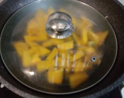 ใส่ฟักทองลงไปในกระทะ ใส่น้ำลงแค่ไปพอท่วมฟักทอง แล้วปิดฝาไว้ให้ฟักทองสุก
