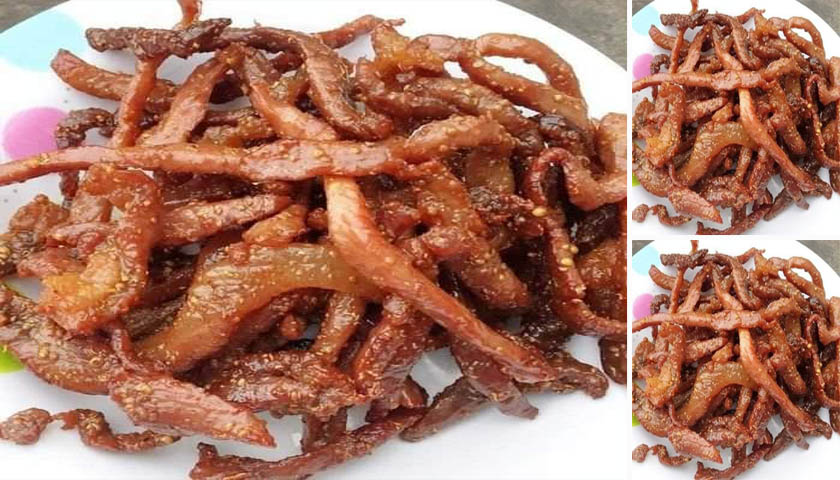 จากนั้นนำส่วนผสม พริกป่น ข้าวคั่ว พริกขี้หนูซอย หอมแขก น้ำตาลทราย น้ำมะนาว น้ำปลามาคลุกเคล้าให้เข้ากัน ใส่ผักชีฝรั่ง ต้นหอมซอยคนให้เข้ากันชิมรสตามใจชอบ