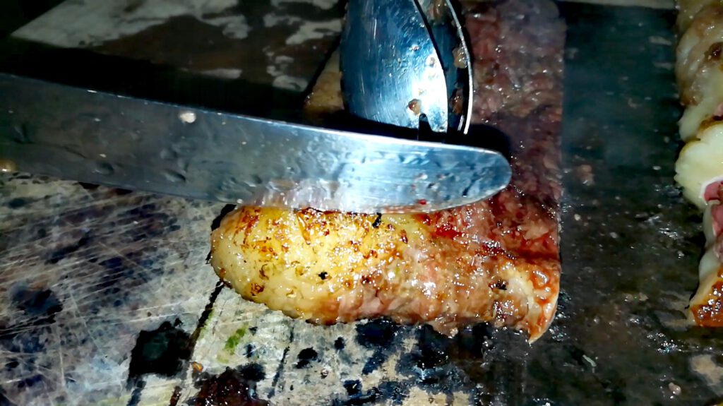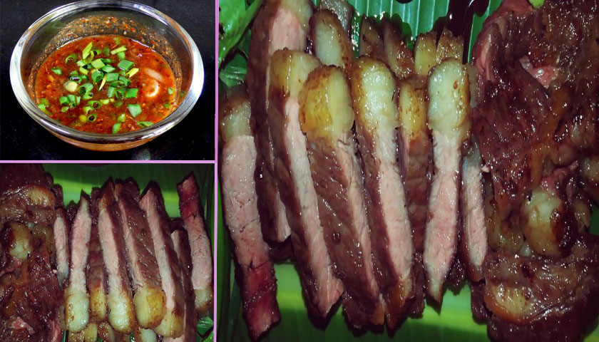 นำเนื้อวัวที่หมักไว้ (จากข้อ 1) ไปย่างด้วยไฟเตาถ่านร้อนปานกลางจนพอสุก