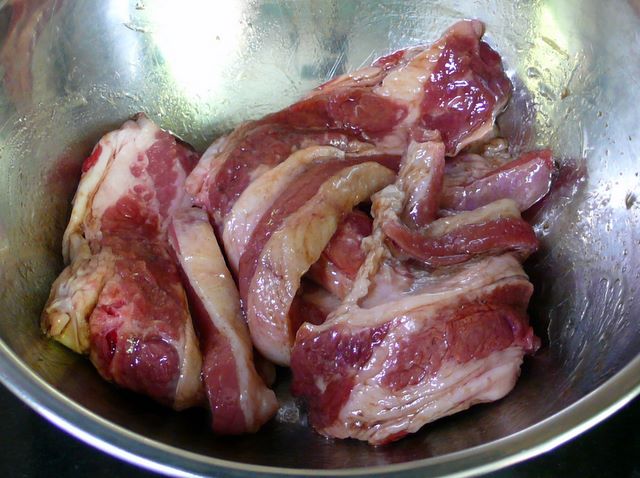 1.เนื้อวัว เลือกเนื้อส่วนหน้าอกติดมันเล็กน้อย แล่เป็นแผ่นใหญ่หนาประมาณ 1 ซม. 500 กรัม