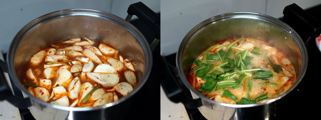 ใส่น้ำลงไปพอเดือดตามด้วยคนอร์ต้มยำ เครื่องต้มยำ ตะไคร ข่า ใบมะกูดพอเดือดใส่เห็ดฟางลงไปต้มให้สุก