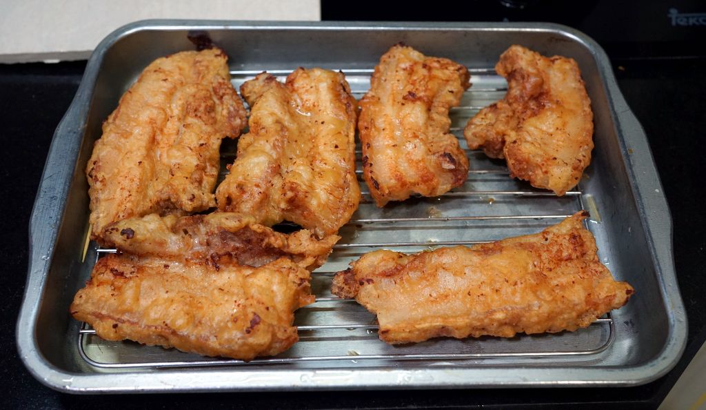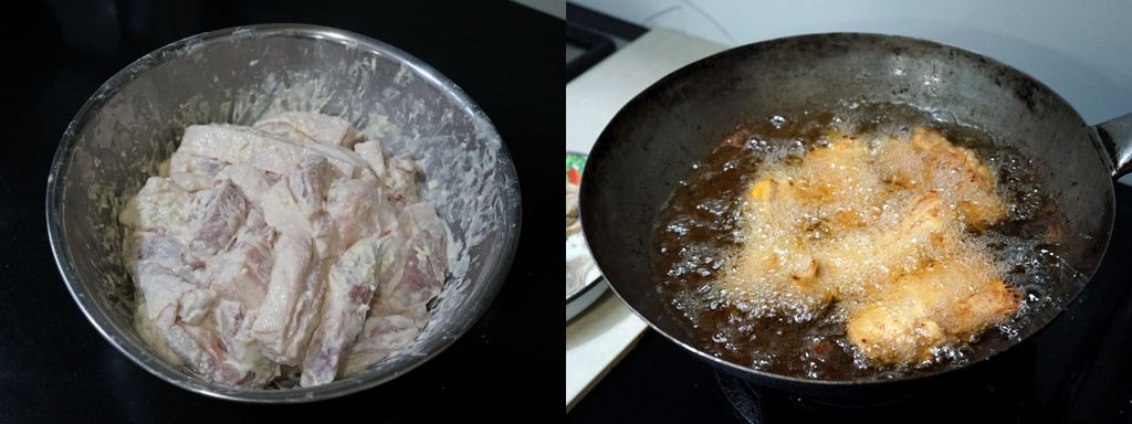 นำไปชุบแป้งทอดกรอบ แล้วนำไปทอดจนสุกเหลือง