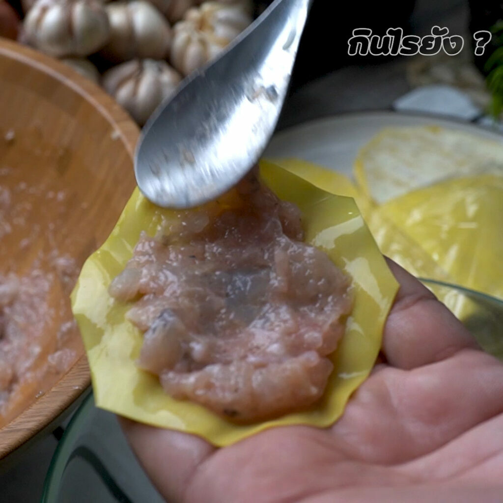 จากนั้นจัดการใส่ไส้ลงไปตรงกลาง แล้วก็จีบเข้าหากัน