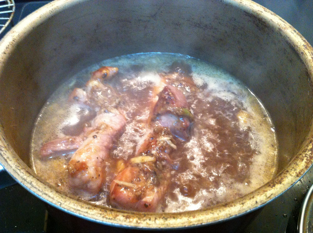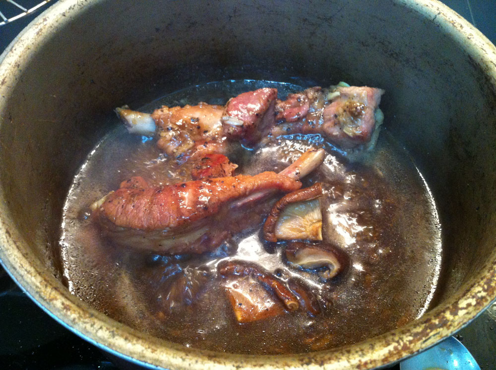 พอเดือดก็หรี่ไฟลงแล้วตุ๋นต่อประมาณเกือบ 1 ชั่วโมงจนกกระดูกหมูเปื่อย สุดท้ายใส่เห็ดหอมลงไป ตามด้วยซีอิ๊วขาว น้ำตาลทรายและพริกไทย น้ำซุปจะหนืด ๆ เพราะเราใส่แป้งมันลงไปตอนหมักกระดูกหมู แต่ถ้าไม่หนืดก็เทแป้งมันละลายน้ำลงไปหน่อยตามชอบ