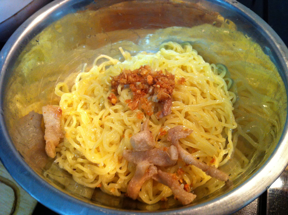 เวลาเสิร์ฟก็นำคะน้าไปลวก ตามด้วยลวกเส้นบะหมี่ คลุกเส้นด้วยน้ำมันกระเทียมเจียวกากหมูจัดจานโรยต้นหอมซอยลงไปด้วยค่ะ