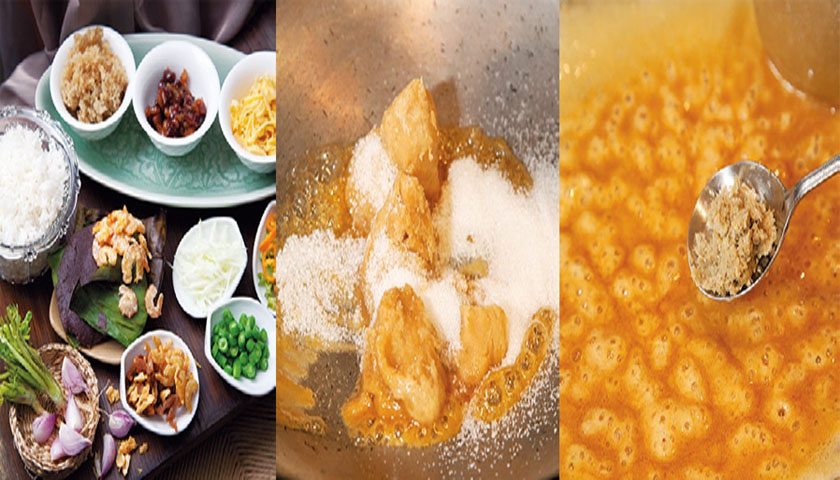 หันมาเตรียมเครื่องข้าวคลุกกะปิ ได้แก่ ปลาฟู หมูหวาน หมูทอดกรอบ กุ้งแห้งทอดกรอบ ไข่ฝอย ให้เสร็จก่อน โดย ปลาฟูใช้ปลาช่อนย่างไฟกลางค่อนไปทางอ่อนให้เนื้อปลาสุกและหมาดดี แกะเอาแต่เนื้อมาสับพอแหลก ใส่ลงทอดในน้ำมันทีละหยิบมือให้ฟูเต็มหน้าน้ำมันแล้วใช้ตะหลิวพับขอบเข้าหากันให้เป็นแพสี่เหลี่ยม